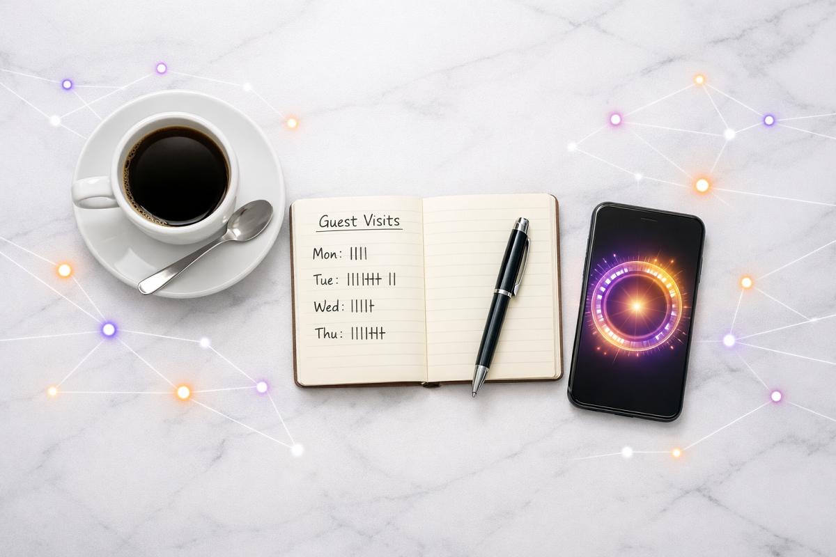Guest visits. WiFi connects. Visit data lives in hardware, untracked.