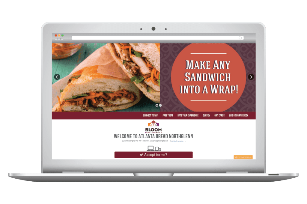 The Bloom captive portal lets business owners choose what appears on their WiFi landing page from a list of functions such as: