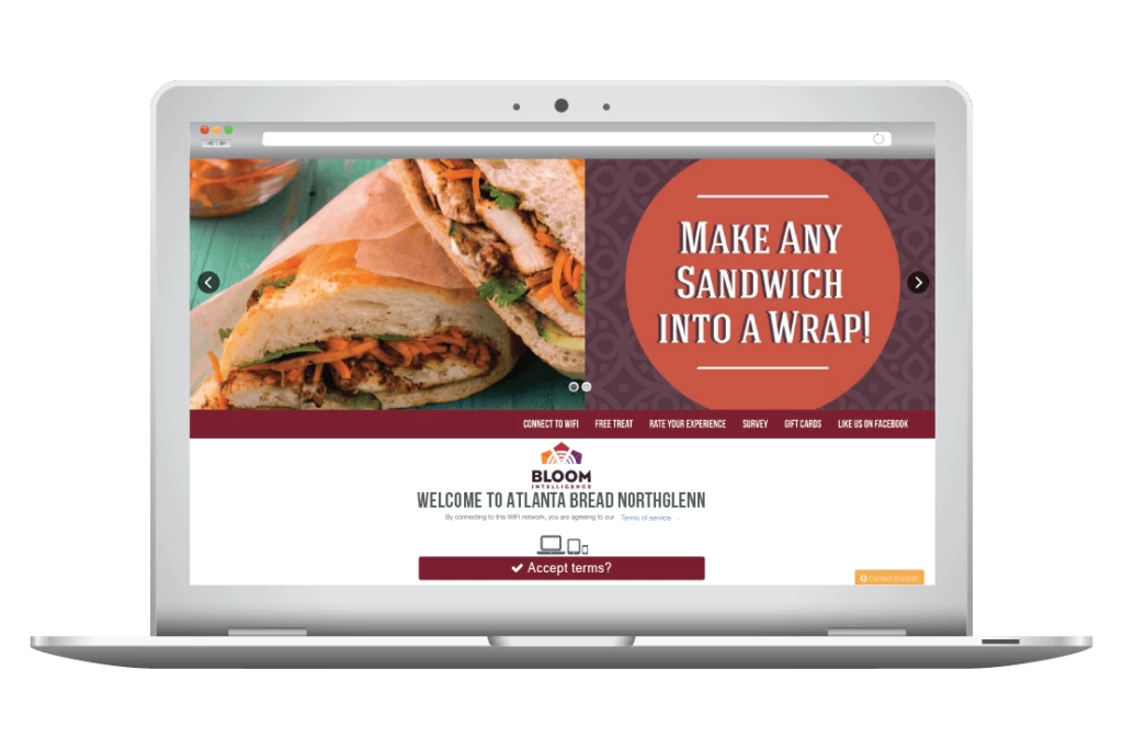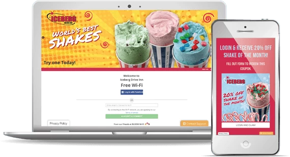 Captive Portals or WiFi landing pages are a great way to promote your restaurant or retail locations. Some of the most engaging landing pages may include enticing design elements and guest opt-in fields to build customer databases that ultimately unlock guest insights that are used to power marketing automation campaigns. Below are some captive portal examples: